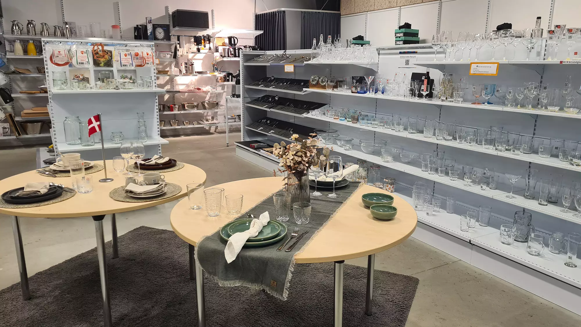 Det kan være svært at vurdere farver og kvalitet online, så derfor har vi indrettet et område af vores lager som showroom. Her er det særligt isenkram, der er udstillet, så du kan se vores glas, porcelæn og køkkenredskaber inden du køber. Du kan også prøve køkkensko og arbejdstøj til køkkenet, så du kan finde de helt rigtige størrelser.